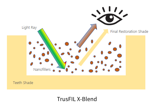ナノフィラーにより、TrusFIL X-Blendが空洞に充填されると、色と光学特性、下の樹脂で覆われた歯の構造、および残りの露出した歯の構造がすべて相互作用します。 それが、これらの要因が一緒になって光の相互作用に影響を与え、カメレオン効果につながる方法です。